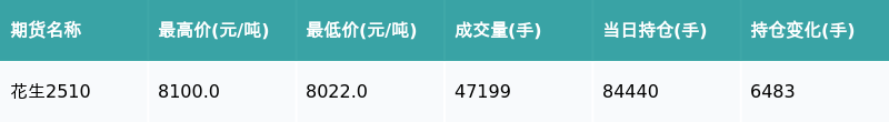 南财智讯5月7日电汇盈策略,南财金融终端盘后期货数据显示,郑州商品交易所的花生主力合约收涨0.35%,收盘报8088.0元/吨,日内资金流出7947.82万元。其他相关指标见下表:
