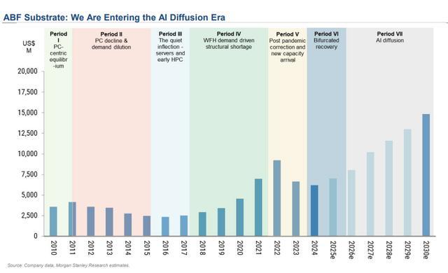 ABF基板的供需拐点就在眼前——2027年起将进入持续短缺状态,T型玻璃基板供给紧缺甚至会延续到2028年。AI GPU/ASIC和Networking用板在整个ABF需求中的比重,预计从2020年的约18%升至2030年的75%以上。
